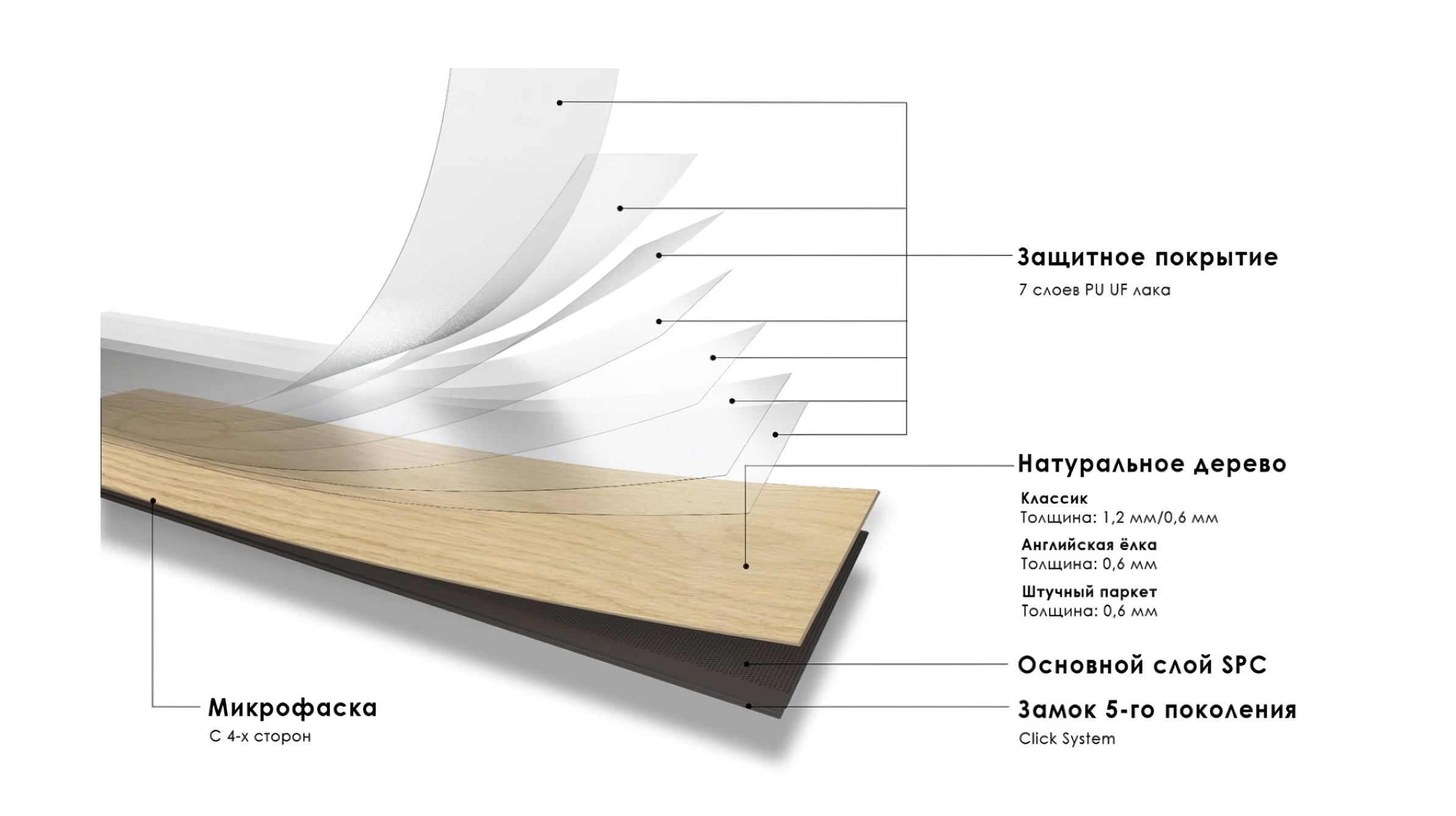• SPC‑основа, грунтовка и 7 слоёв лака — то, что дарит живому дереву водостойкость на 100 %, совместимость с тёплыми полами до +28 °C и обеспечивают пожизненную гарантию.