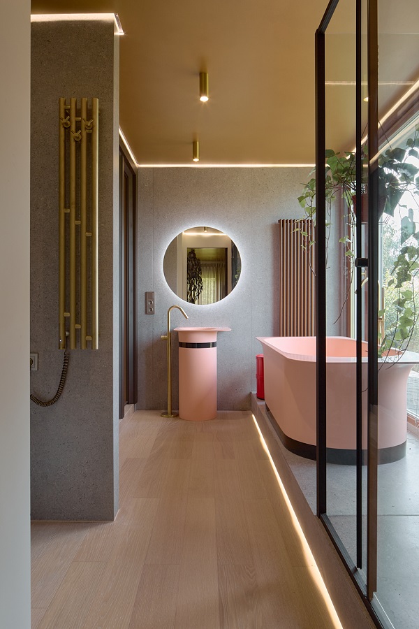 • Линия из кварцпаркета на полу, стене и потолке — необычный акцент в интерьере, который корректирует высоту потолков, неправильную форму комнаты и создаёт нужную атмосферу.