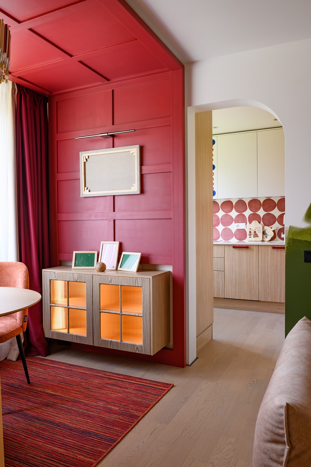 Весь интерьер получился очень гармоничным, и по цветовой гамме, и по расстановке мебели. Не обошлось и без лёгкого хулиганства дизайнера в виде частично закрашенных картин.